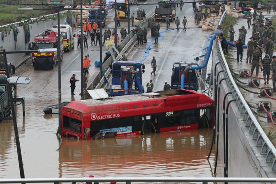 2023년 충북 청주시 오송읍 궁평2지하차도에서 발생한 지하차도 침수 현장에서 소방당국이 구조작업을 진행하고 있다. 뉴스1