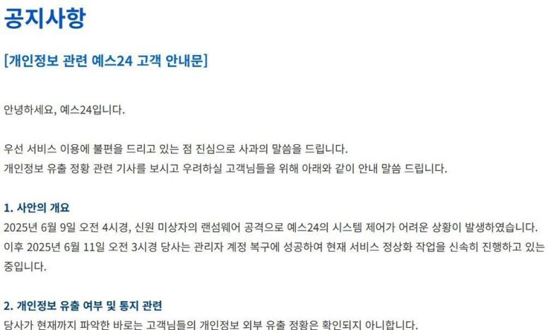 이 과정에서 예스24는 랜섬웨어 피해 사실을 은폐하는 데만 급급했다. 해킹 발생 뒤 이용자에게 즉시 알리지 않은 채 이틀간 ‘시스템 점검’을 핑계로 누리집을 닫았고, 최수진 국민의힘 의원이 랜섬웨어 공격 사실을 공개한 뒤에야 해킹 피해를 인정했다. 11일에는 “한국인터넷진흥원과 협력해 원인 분석 및 복구 작업에 총력을 다하고 있다”고 공지했지만, 한국인터넷진흥원이 이날 밤 이례적으로 예스24의 공지가 사실과 다르다고 보도자료를 냈다. 사전 정보보안뿐만 아니라 사후 대응도 불신만 키운 셈이다.