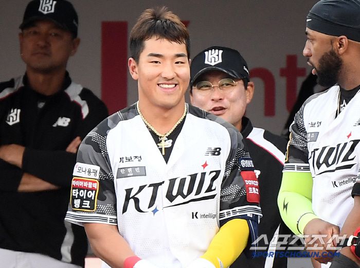 12일 수원 KT위즈파크에서 열린 롯데-KT전. 3회말 2사 1, 3루 안현민이 전 타석 투런포에 이어 스리런포를 터트렸다. 이종범 코치가 활짝 웃고 있다. 수원=정재근 기자 cjg@sportschosun.com/2025.6.12/
