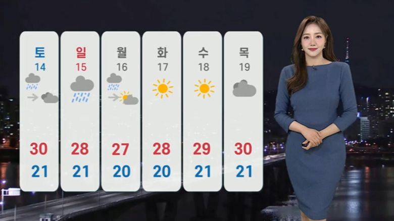 이후 열대 수증기가 유입되면서 내일은 충청 이남을 중심으로 토요일에는 전국으로 비가 확대되겠습니다.