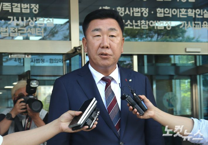 이범석 청주시장이 청주지방법원 법정동 앞에서 기자들의 질문에 답하고 있다. 임성민 기자