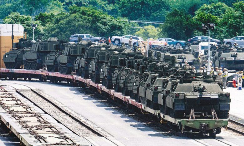 도널드 트럼프 미국 대통령의 79번째 생일과 미 육군 창설 250주년을 기념해 오는 14일(현지시간) 워싱턴DC에서 열리는 열병식에 선보일 탱크들이 9일 메릴랜드주 재섭에서 이동을 준비하고 있다. AFP연합뉴스 |