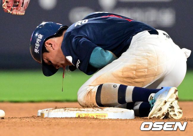 연장 10회초 1사 1루 롯데 장두성이 KT 투수 박영현 송구 실책 때 2루까지 진루한 후 고통을 호소하고 있다. 대주자 한승현으로 교체됐다. 2025.06.12 /cej@osen.co.kr