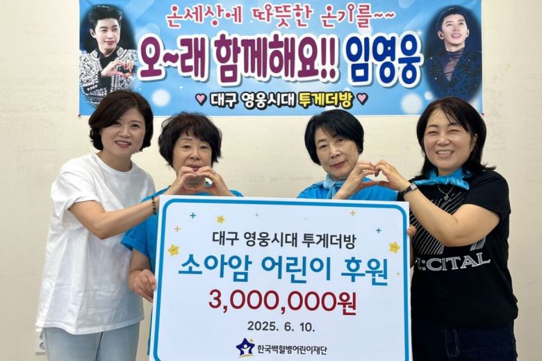 소아암 전문 비영리단체 한국백혈병어린이재단은 임영웅의 지역 팬카페 ‘대구 영웅시대 투게더방’이 소아암 어린이를 위한 치료비에 보태달라며 300만원을 기부했다고 12일 밝혔다.