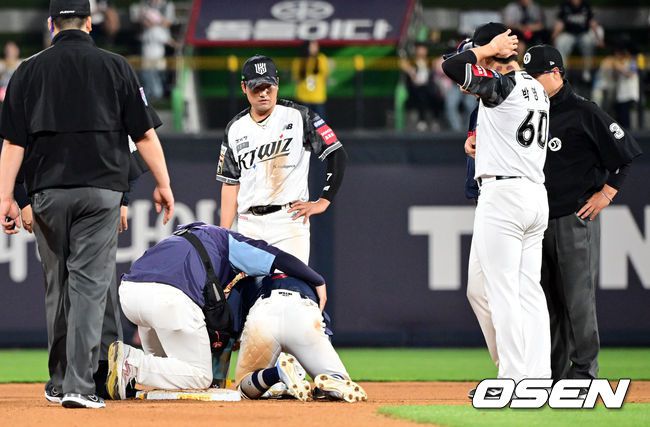 연장 10회초 1사 1루 롯데 장두성이 KT 투수 박영현 송구 실책 때 2루까지 진루한 후 고통을 호소하고 있다. 대주자 한승현으로 교체됐다. 2025.06.12 /cej@osen.co.kr