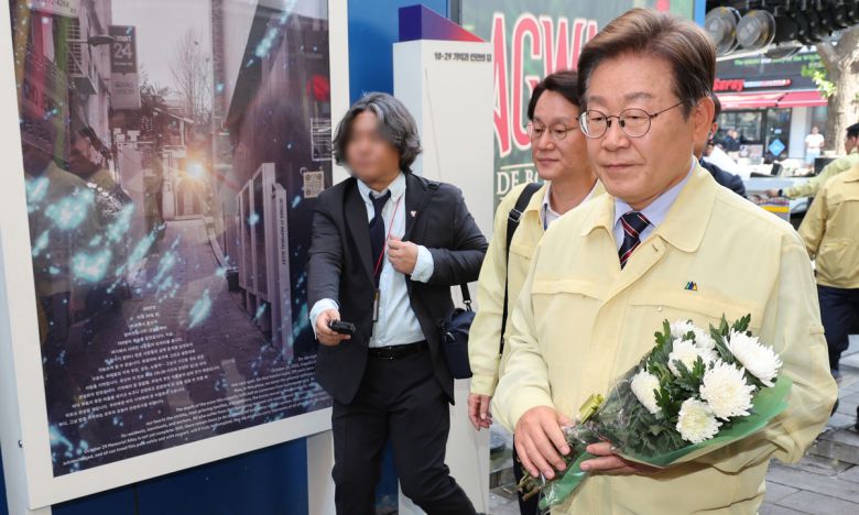 이재명 대통령이 12일 수해 대비 현장 점검을 위해 서울 서초구 환경부 한강홍수통제소 방문을 마친 후 용산구 이태원참사 사고현장을 찾아 헌화하기 위해 꽃을 들고 이동하고 있다. 대통령실사진기자단 |