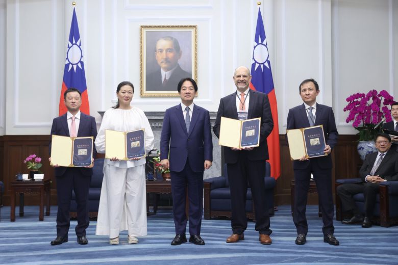 라이칭더 총통(가운데)이 2024년 7월 8일 오전 총통부에서 후쿠모토 요시나리 일본 롯데주식회사 사이버안보부장(좌1), 정원원(鄭雯文) 미국 디지털 셀프랩스 LLC 창립자(좌2), 마크 피셔 동아시아슈퍼리그 상무이사(우2), 루동후이(盧東暉) 타이완 마이크론 회장(우1)에게 취업골드카드를 직접 교부했다. / 대만 정부