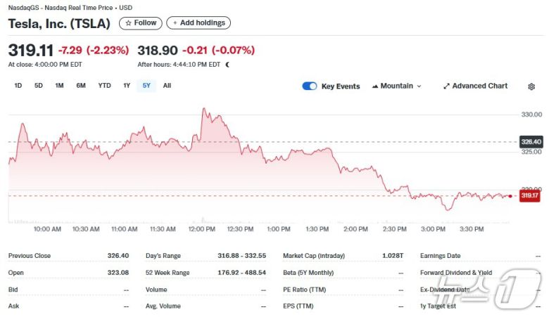 12일(현지시간) 뉴욕증시에서 테슬라는 2.23% 하락한 319.11달러를 기록했다.
