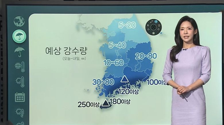 제주는 오늘 밤부터 내일 오전사이, 남해안과 지리산부근은 내일 새벽부터 오전 사이에 시간당 최대 50mm의 호우가 쏟아지겠고요.