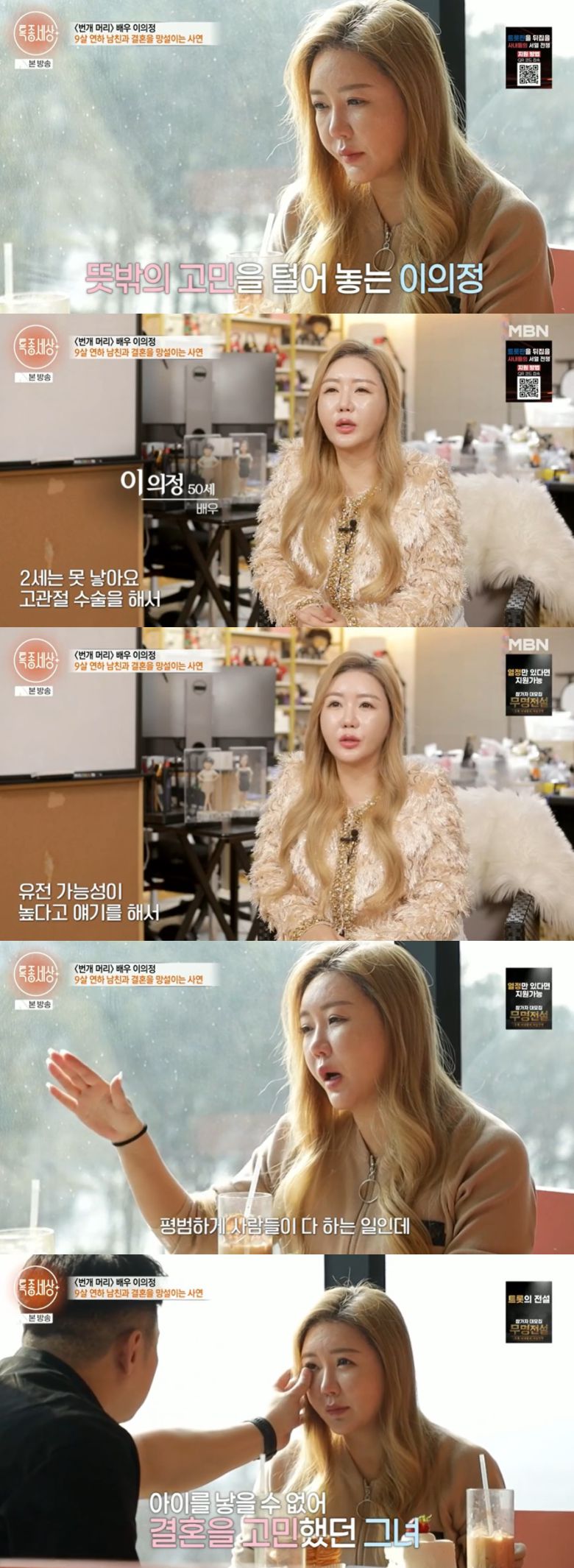 이의정은 "솔직히 결혼을 많이 미루고 했었던 것도 그런 게 마음에 걸렸다. 평범하게 사람들이 하는 일인데 나는 그렇게 못하니까"라며 눈물을 흘렸다.