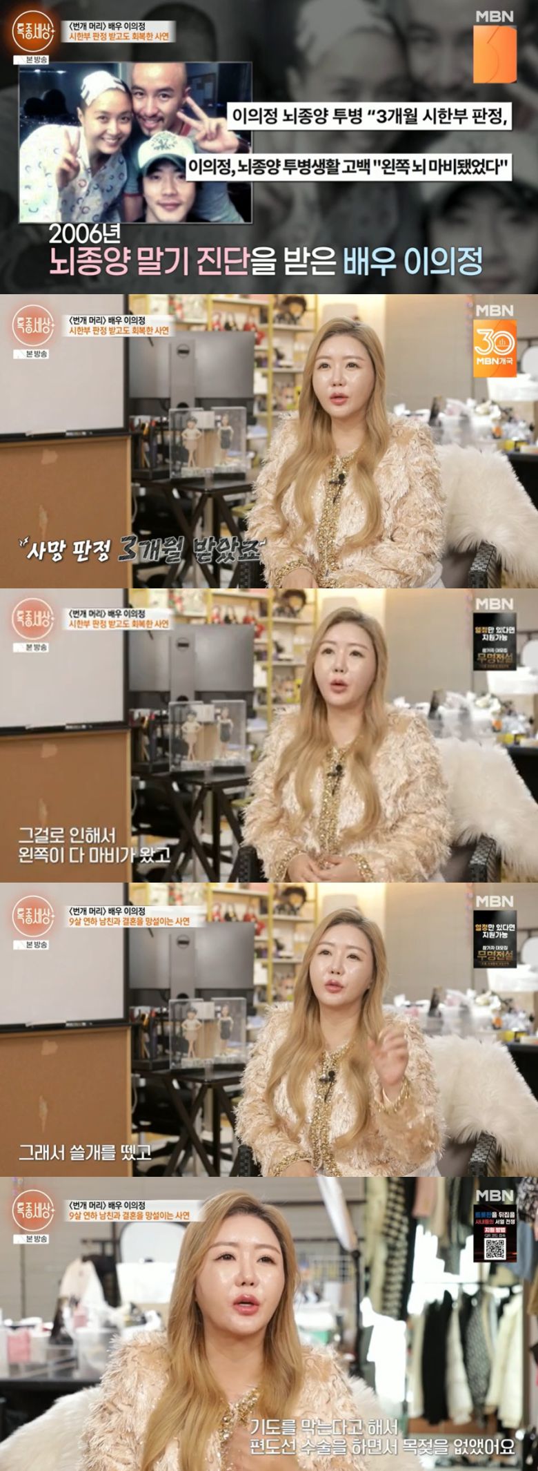 2006년 뇌종양 말기 진단을 받은 이의정은 이후 3개월 시한부 판정으로 많은 이들을 안타깝게 했다. 이의정은 "응급실에 가서 CT촬영 MRI를 했는데 상태가 안 좋아서 '얼마 살지 못합니다. 사망 판정 3개월 받았다"라고 덧붙였다.