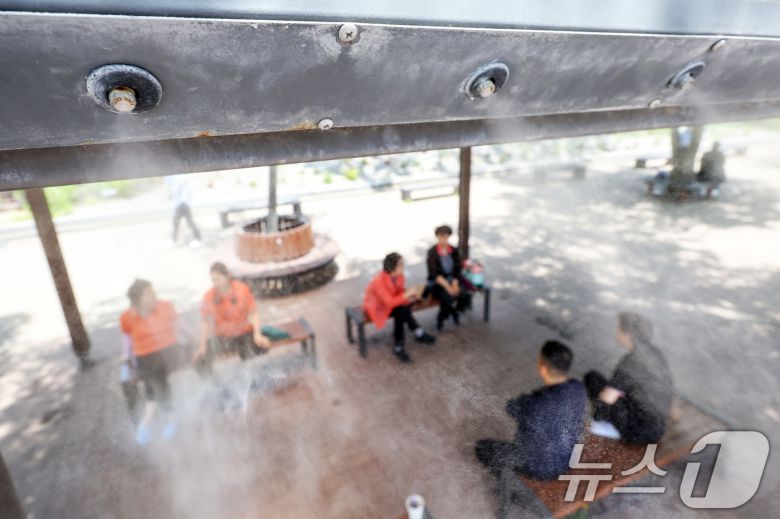 서울 지역 낮 최고기온이 31도까지 올라 초여름 더위가 찾아온 12일 서울 영등포구 여의도공원에서 시민들이 쿨링포그 아래 무더위를 쫓고 있다. 2025.6.12/뉴스1 ⓒ News1 민경석 기자