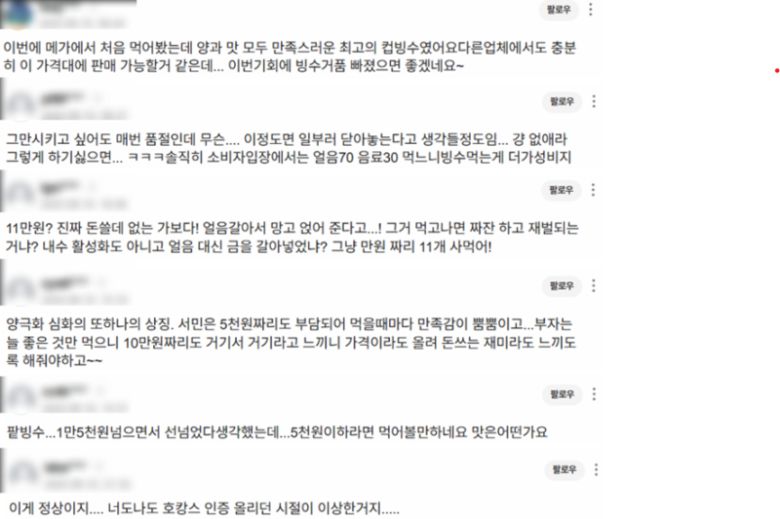 누리꾼들은 “이번 기회에 빙수 거품 빠졌으면 좋겠다” “소비자 입장에서는 ‘얼음 70, 음료 30’ 먹느니 빙수 먹는 게 더 가성비다” “양극화 심화의 또 하나의 상징이다” “이게 정상이다 너도나도 호캉스 인증 올리던 시절이 이상했다” “얼음 대신 금을 갈아 넣었나? 만 원짜리 11개 사 먹어라”라고 말했습니다.