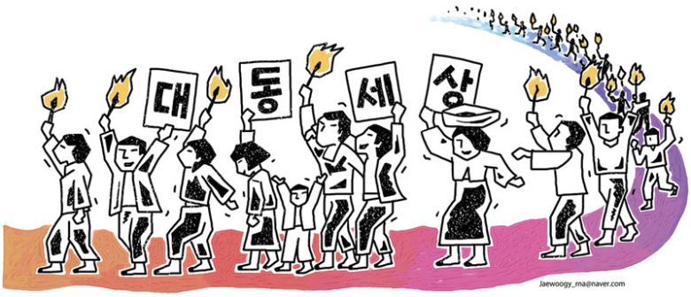 이상사회 지향의 대동사상은 ‘예기’ 예운편에 설명돼 있다. 예운편에 대도(大道)가 행해지면 천하에 공의(公義)가 구현된다고 했다. ‘현명한 자를 지도자로 뽑고 능력 있는 사람에게 관직을 수여하며 신의와 화목을 가르치게 되면 사람들은 자기 어버이만을 어버이로 여기는 것이 아니고, 단지 자기 자식만을 자식으로 여기는 것도 아니라’고 했다. ‘사람들은 재화를 꼭 개인적으로 저장해야 할 필요도 없고 또 일하는 것도 오직 자기만을 위해 하는 것은 아니며, 남을 해치려는 음모가 생기지도 않고 도적이나 난적(亂賊)도 발생하지 않는 그런 사회를 대동이라 한다’고 풀이했다.