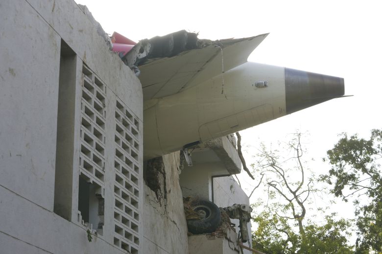 12일(현지시간) 서부 구자라트주(州)의 아메다바드에서 추락한 여객기의 잔해가 건물 밖으로 튀어나와 있다. AP=연합뉴스 |