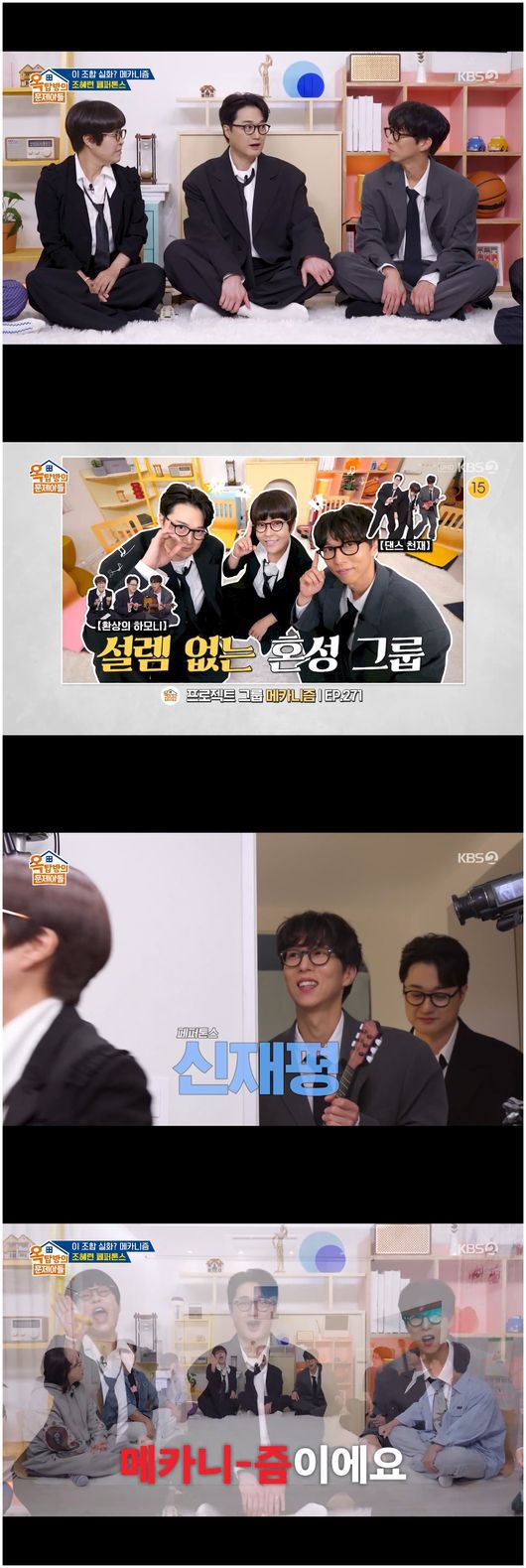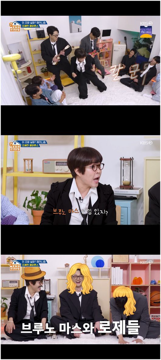 12일 방영한 KBS2TV 예능 ‘옥탑방의 문제아들’에서는 독특한 조합인 페퍼톤즈와 조혜련의 컬래버 팀 '메카니즘'이 등장했다. 유재석의 제안과 조혜련의 추진력으로 이뤄진 이들의 컬래버는 오버핏 정장 무대의상으로 등장해 시선을 끌었다.