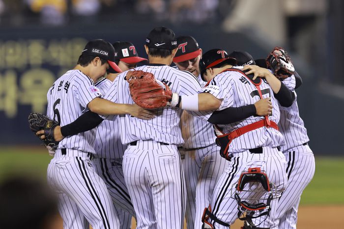 LG가 27일 서울 잠실구장에서 열린 2025 KBO리그 정규시즌 한화전 승리 후 마운드에 모여 자축하고 있다. 사진 | 연합뉴스 |