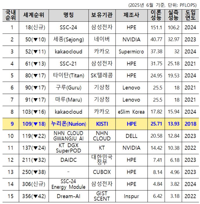 우리나라가 보유한 슈퍼컴퓨터를 모두 합친 성능은 국가 순위로 따질 때 세계 9위인 것으로 집계됐어요. 개별 기업 또는 기관이 소유한 슈퍼컴퓨터 성능 순위로는 삼성전자가 세계 18위, 네이버가 50위, 카카오가 52위 순이었네요.