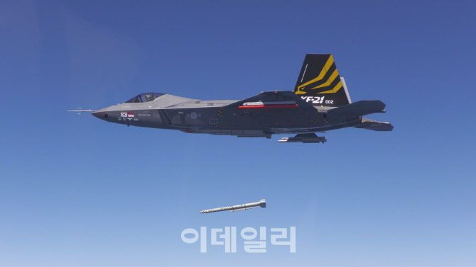 KF-21 시제 2호기가 공대공미사일 ‘미티어’에 대한 무장분리 시험을 하고 있다. (사진=방위사업청) |