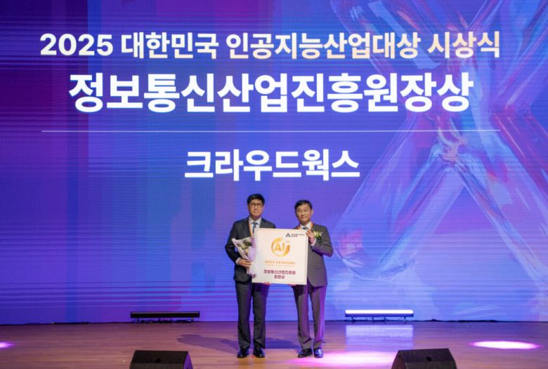 AI 테크 기업 크라우드웍스가 12일 코엑스에서 열린 ‘2025 대한민국 인공지능산업대상’에서 기술(Cross-industry) 부문 정보통신산업진흥원(NIPA) 원장상을 수상했다.