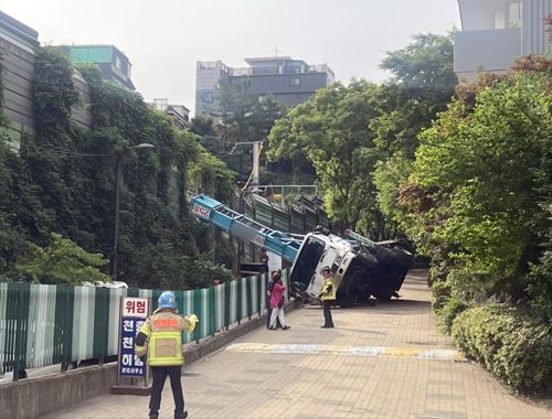 경의중앙선, 사다리차 전도로 일부 운행 중단 (서울=연합뉴스) 13일 오전 8시 20분께 서울 경의중앙선 가좌역∼신촌역 구간 사다리차 전도 사고로 인해 전기공급 장애가 발생, 열차 운행이 지연되고 있다. 사진은 전도된 사다리차. 2025.6.13 [독자 제공. 재판매 및 DB금지]