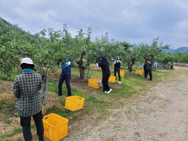 이날 활동은 일손이 부족한 사과농장을 방문해 사과열매 솎기작업과 폐자재 수거작업 등 일손돕기에 구슬땀을 흘렸다.