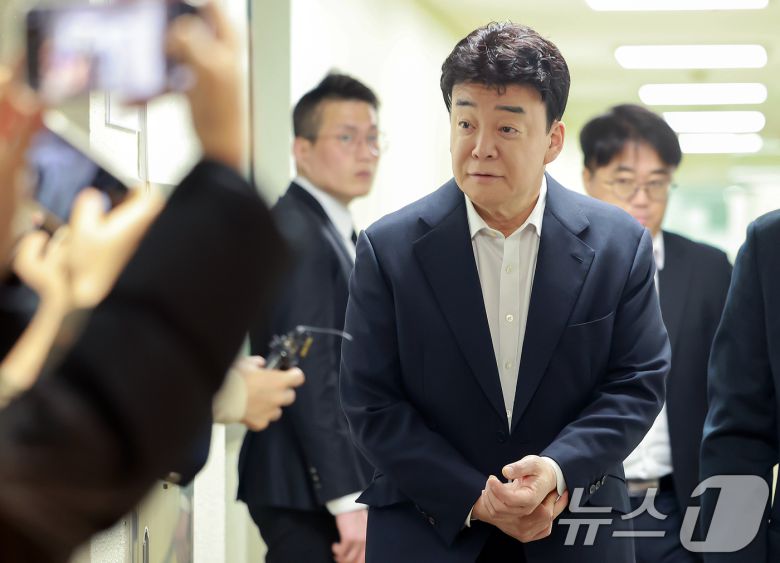 백종원 더본코리아 대표가 28일 서울 서초구 스페이스쉐어 강남역센터에서 열린 정기 주주총회에서 참석하고 있다. 2025.3.28/뉴스1 ⓒ News1 김진환 기자