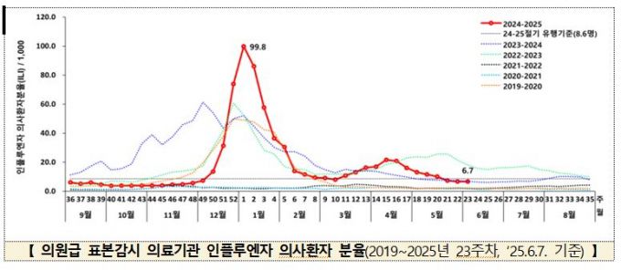 의원급 표본감시 의료기관의 외래환자 1000명당 인플루엔자 의사환자 수는 이번 동절기 높은 정점(2025년 1주 99.8명)을 보였다. 이후 감소세였다 봄철 2차 정점(2025년 15주차 21.6명)을 보인 후 감소했다. 최근 3주 연속 8.6명 이하로 떨어져 23주차에는 6.7명을 기록했다.