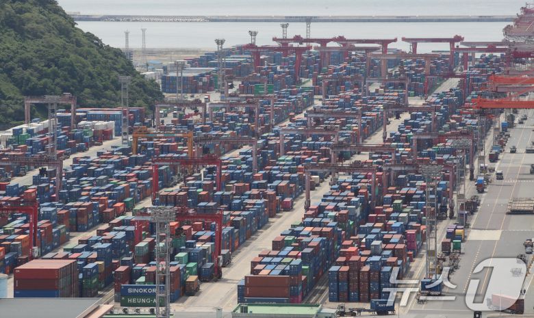 11일 부산항 신선대부두 야적장에 컨테이너가 가득 쌓여 있다. 이날 관세청이 잠정 집계한 6월 1~10일 수출입동향에 따르면 이 기간 수출은 지난해 같은 기간보다 5.4%늘어난 155억 달러를 기록했다. 같은 기간 수입은 172억 달러로 전년동기대비 11.5% 증가했다. 무역수지는 17억 달러 적자를 냈다. 이 기간 대미 수출은 전년동기 대비 3.9% 증가했다. 지난 4월에는 6.8%, 5월엔 8.1%씩 감소한 바 있다. 2025.6.11/뉴스1 ⓒ News1 윤일지 기자 |