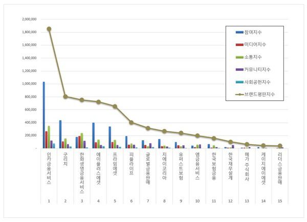 3위, 한화생명금융서비스 브랜드는 참여지수 178,784 미디어지수 194,709 소통지수 240,556 커뮤니티지수 120,277 사회공헌지수 18,597이 되면서 브랜드평판지수 752,922로 분석됐다. 지난 5월 브랜드평판지수 811,833과 비교해보면 7.26% 하락했다.