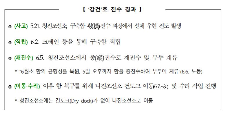 북한 구축함은 지난달 21일 청진조선소에서 열린 진수식 도중에 배 뒷부분이 물에 먼저 들어가고 뱃머리가 육지에 걸리면서 넘어졌다. 김 위원장은 사고를 직접 목격하고 관련자를 처벌하고 6월말로 예고된 제8기 제12차 당 전원회의 전까지 수리를 마치라고 지시했다.