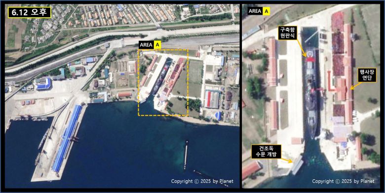 13일 조선중앙통신은 “조선인민군 해군 구축함 진수기념식이 6월 12일에 라진조선소에서 진행됐다”고 보도했다. 지난달 이 구축함이 넘어져 21일 불발됐던 진수식을 다시 강행한 것이다. 북한은 당시 넘어진 구축함 위에 파란 천을 씌워놓은 장면 등이 위성사진에 고스란히 찍혀 굴욕을 당한 바 있다. 김 위원장이 격노하며 강력하게 책임을 묻겠다고 한 사실도 전해졌었다.
