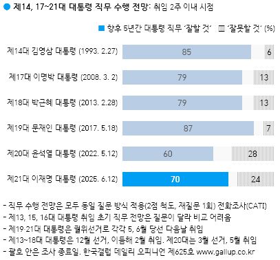 이재명 대통령이 향후 5년간 직무 수행을 ‘잘할 것’이라는 응답이 70%인 여론조사 결과가 13일 나왔다.