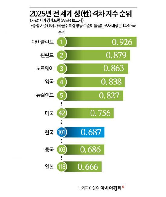 전 세계 평균(0.688)에 비춰볼 때 한국의 성평등 달성률은 하위권이다. 상위 10개국 중 유럽 국가가 8개로, 아이슬란드는 16년 연속 1위를 기록해 유일하게 성 격차 90% 이상을 달성한 국가로 자리매김했다. 동아시아·태평양지역에서는 뉴질랜드가 유일하게 상위권에 포함됐다. 한국(101위)과 더불어 중국(103위), 일본(118위) 등 동아시아 3국은 나란히 하위권이다.