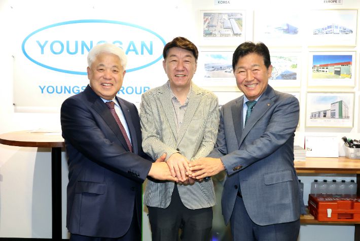 전주 하계올림픽 유치 의지를 다지는 자리에서 김정태 전주상공회의소 회장과 우범기 전주시장, 박종범 월드옥타 회장(왼쪽부터)이 손을 맞잡고 있다. 전주시 제공