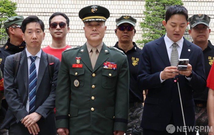 [서울=뉴스핌] 양윤모 기자 = 이재명 대통령이 채상병 특검으로 이명현 전 국방부 검찰단 고등검찰부장을 지명한 가운데, 해병대 '채 상병 순직 사건'과 관련해 항명 및 상관명예훼손 혐의로 기소된 박정훈 전 해병대 수사단장(대령)이 13일 서울 서초구 서울고등법원에서 열린 항소심 첫 공판에 출석 변호인의 발언을 경청하고 있다. 2025.06.13 yym58@newspim.com