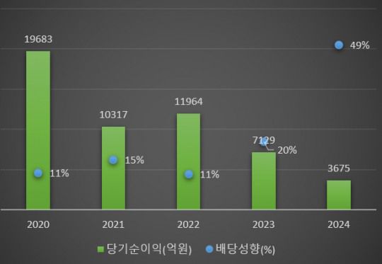이에 따라 배당성향(순이익 대비 배당금 비율)은 2023년 20.3%에서 2024년 49.2%로 2.4배 확대됐다. 이는 작년 3월 수립한 1차 밸류업 정책에서 발표한 최소 주당 배당금 1000원(보통주), 최소 배당성향 25%를 지키기 위해서다.