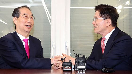 지난 달 11일 김문수 국민의힘 대선후보와 한덕수 전 국무총리가 여의도 국민의힘 대선후보 사무실에서 회동을 하고 있던 모습. 뉴스1
