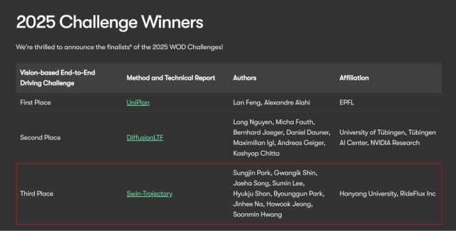 라이드플럭스는 웨이모 오픈 데이터셋 챌린지 비전 기반 엔드투엔드(E2E) 자율주행 부문 3위에 올랐다. 엔비디아, 샤오미, 스위스 로잔연방공대, 캐나다 밀라(MILA) 인공지능(AI) 연구소 등 전세계 29개 자율주행 연구개발팀과 경쟁해 입상했다. 이번 챌린지에 한양대학교 IRCV 연구팀과 공동으로 참가해 웨이모가 공개한 카메라 영상 데이터를 기반으로 자율주행차의 이동 경로를 효율적으로 세웠다. 라이드플럭스와 한양대 연구팀이 제안한 ‘스윈-트레젝토리’(Swin-Trajectory) 방법은 AI 기술을 기반으로 구조화된 차량 이력과 이미지의 맥락을 파악해 미래 궤적을 계획하는 알고리즘이다. 이 방법은 시공간 모델링을 바탕으로 정확도가 높고 실시간 연산속도도 빠르다는 평가를 받는다.