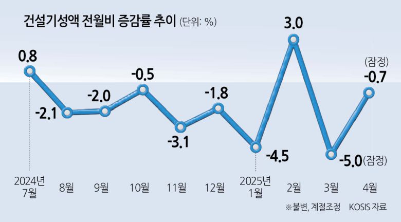 4월에도 상황은 나아지지 않고 악화했다. 4월 건설기성은 지난해 같은 달과 비교해 20.5% 줄면서 12개월 연속 감소세를 이어갔다. 감소 폭도 전월(-16.3%)보다 확대됐다. 건축(-23.0%)은 주거용과 비주거용 모두 부진했고, 토목(-12.6%) 부문도 전기기계와 플랜트를 중심으로 대폭 감소했다.