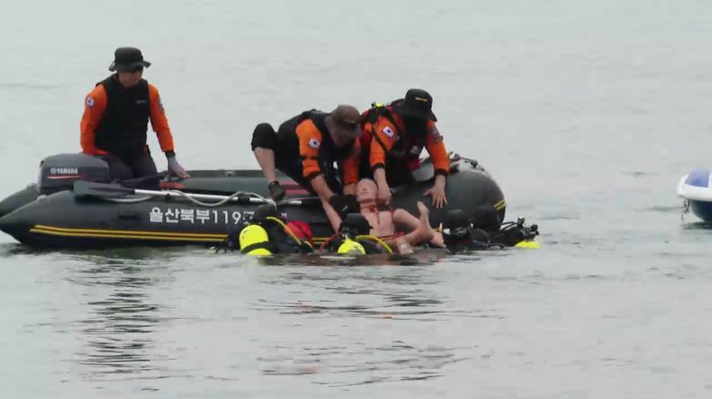 잠수사들이 물 속에서 인체 모형을 끌어올린 뒤 심폐 소생술을 실시합니다.