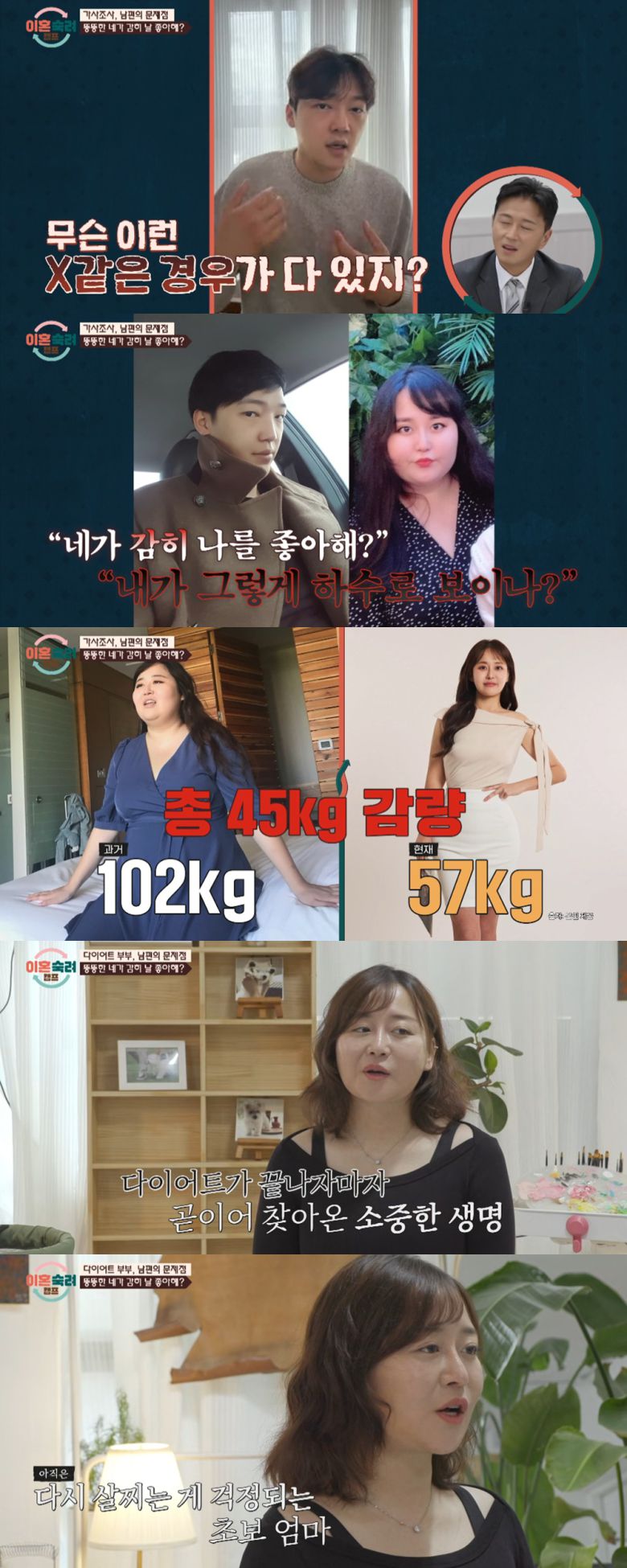 그렇게 아내는 마른 몸을 원하는 남편을 위해 3개월 동안 약 30kg를 감량, 현재까지 총 45kg를 감량하게 된 것. 하지만 아내는 "제가 올해 1월에 임신했다. 여름에 비키니도 좀 입고 즐기고 싶었는데 그런 과정이 전혀 없다. 결국 나중에 애 낳고 살 빼야 하는데 그게 두려워서 매일 체크하고 있다"며 체중 증가에 대한 두려움을 표했다.