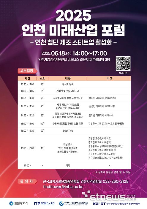 참가 신청은 포스터의 QR코드를 통해 접수할 수 있으며, 자세한 포럼 정보는 인천TP 경영지원센터로 문의하면 된다.