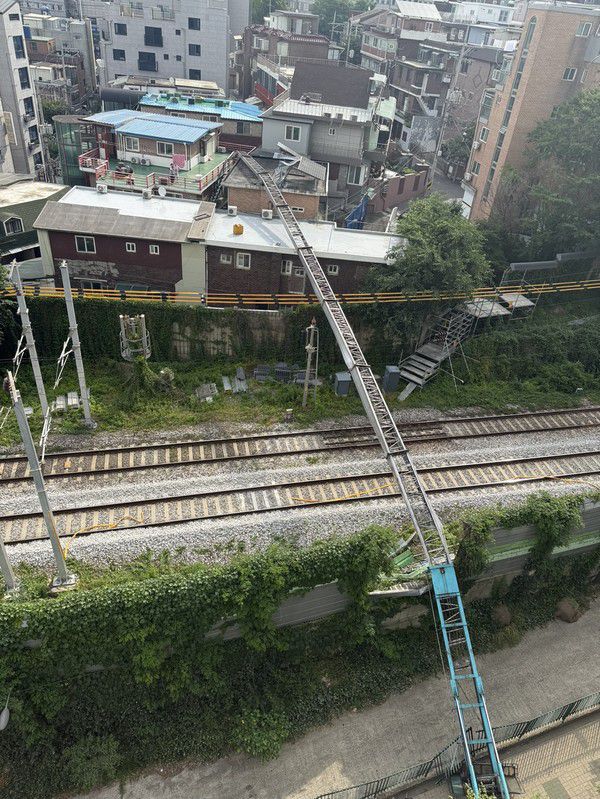 경의중앙선 가좌역, 신촌역 구간 선로 위로 사다리차가 전복됐다. 이 사고로 전기공급 장애가 발생해 열차 운행이 지연됐다. 사진/서대문소방서