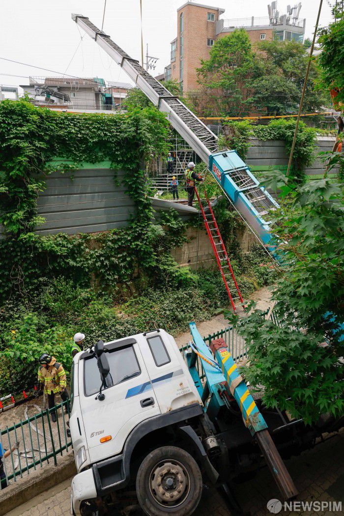[서울=뉴스핌] 류기찬 인턴기자 = 13일 오전 서울 서대문구 경의중앙선 가좌역∼신촌역 구간 선로 위로 사다리차가 넘어져 있는 가운데, 관계자들이 사다리차를 절단하고 있다. 2025.06.13 ryuchan0925@newspim.com