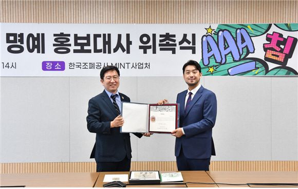 한국조폐공사 성창훈 사장(왼쪽)과 인기 크리에이터 침착맨(오른쪽)이'한국조폐공사 명예 홍보대사 위촉식'에 참여했다./한국조폐공사 |