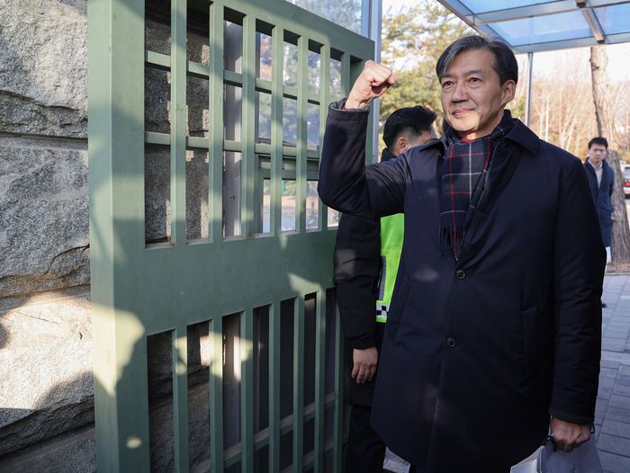 자녀 입시 비리와 청와대 감찰 무마 등 혐의로 기소돼 징역 2년 형이 확정된 조국혁신당 조국 전 대표가 지난해 12월 16일 오전 경기도 의왕 서울구치소 앞에서 수감되기 전 지지자들을 향해 주먹을 쥐어보이고 있다. [연합뉴스] |