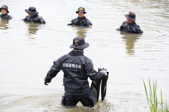 대구 스토킹 살해범 찾아 청주 저수지 수중 수색 - 대구 스토킹 살해범에 대한 추적이 나흘째 이어지고 있는 가운데, 경찰이 그가 잠적한 야산 인근에 위치한 충북 청주시 강내면의 한 저수지에서 13일 오후 수중 수색 작업을 진행하고 있다. 2025.6.13. 연합뉴스 |