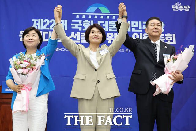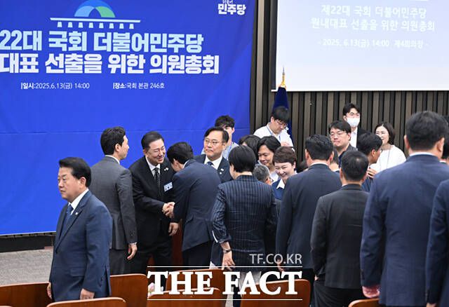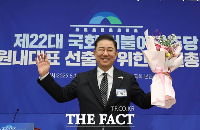 민주당은 이날 오후 국회에서 이재명 정부 출범 이후 야당과의 협상과 국정 운영을 뒷받침할 새 원내대표를 선출, 김병기 후보가 서영교 후보를 꺾고 원내대표로 당선됐다.