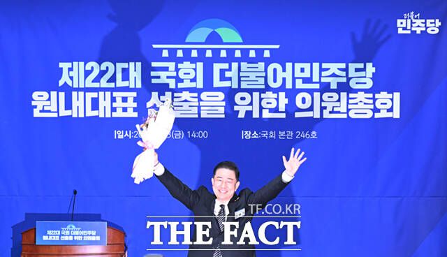 [더팩트ㅣ국회=이새롬 기자] 김병기 더불어민주당 신임 원내대표가 13일 오후 서울 여의도 국회에서 열린 원내대표 선출을 위한 의원총회에서 당선 기념촬영을 하고 있다.